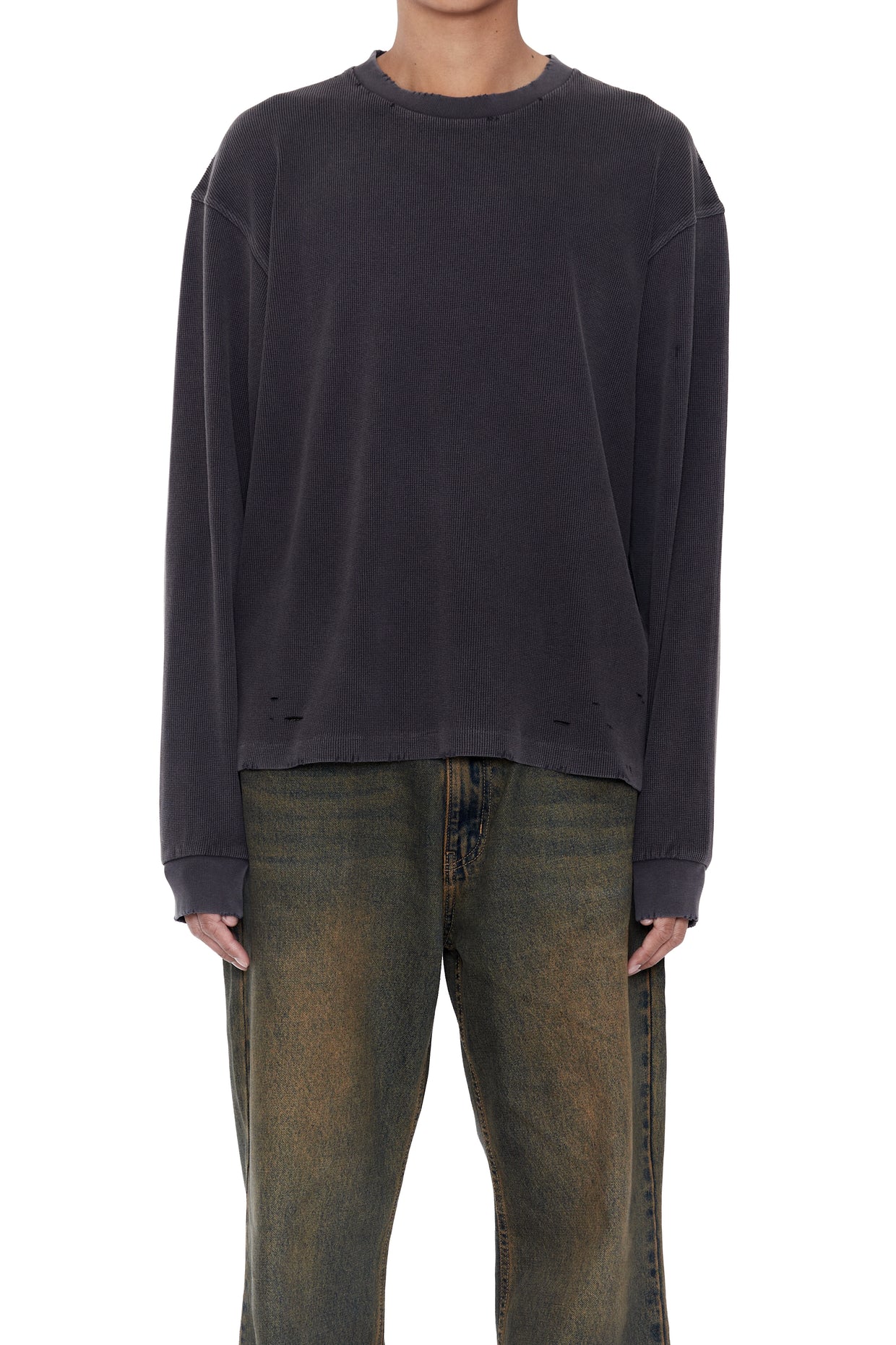 FADED GREY AGING DAMAGED LONG SLEEVE WAFFLE TOPS